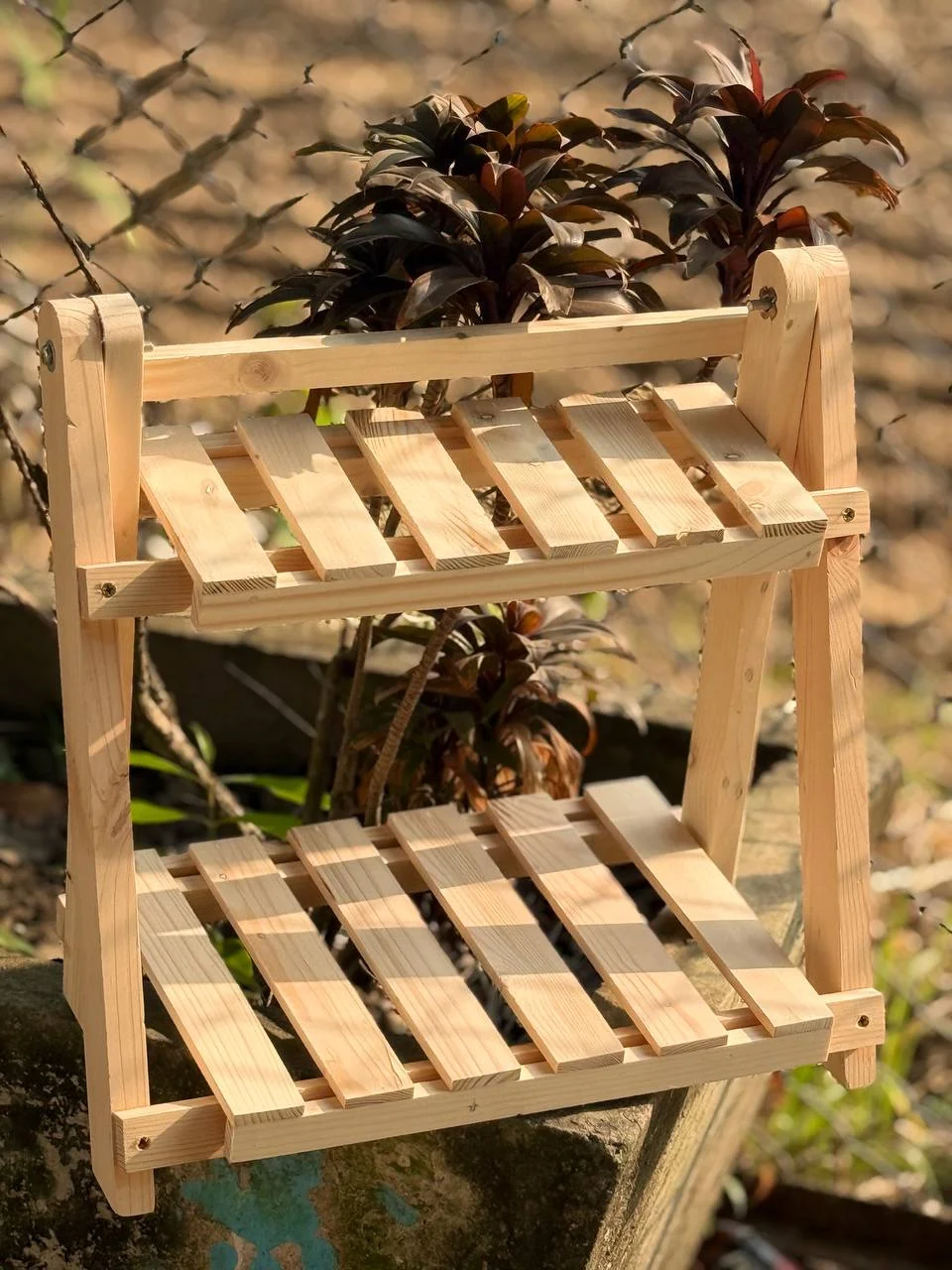 Easy-to-assemble, durable wooden shelf with a double-layer design for better sunlight and plant growth. Foldable for compact storage and versatile use—perfect for plants, books, spices, or decor, indoors or outdoors. Elegant bamboo texture adds a natural touch to any space.